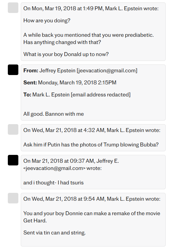 在众议院公布的一封2018年3月的邮件中,马克·爱泼斯坦对杰弗里·爱泼斯坦说,让他去问特朗普前首席策略师史蒂夫·班农,普京手里是否有“特朗普给‘Bubba’口交的照片”。